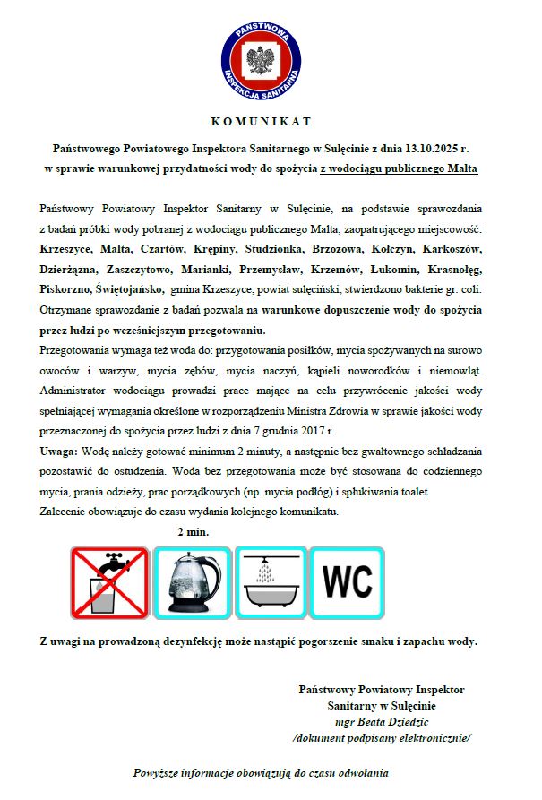Komunikat dotyczy odbiorców zasilanych z wodociągu Malta, w tym mieszkańców Krzeszyc, Malty, Czartowa, Krępin, Studzionki, Brzozowej, Kołczyna, Karkoszowa, Dzierżąznej, Zaszczytowa, Marianek, Przemysława, Krzemowa, Łukomina, Krasnołęgu, Piskorzna i Świętojańska, a także odbiorców na terenie gminy Krzeszyce oraz powiatu sulęcińskiego. Administrator sieci prowadzi dezynfekcję i płukanie instalacji, by jak najszybciej przywrócić jakość wody do parametrów wymaganych przez rozporządzenie Ministra Zdrowia. W tym czasie smak i zapach wody mogą chwilowo się pogorszyć — to naturalny efekt trwających prac.