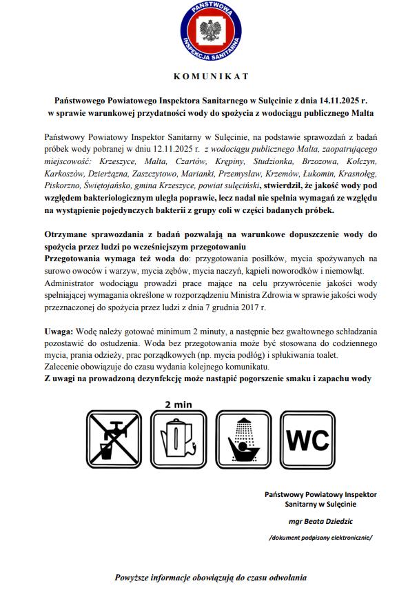 Państwowy Powiatowy Inspektor Sanitarny w Sulęcinie poinformował w piątek, 14 listopada 2025 roku, że jakość wody z wodociągu publicznego Malta – zaopatrującego m.in. Krzeszyce, Maltę, Czartów, Krępiny, Studzionkę, Brzozową, Kołczyn, Marianki, Przemysław, Krzemów i inne miejscowości – uległa poprawie, ale nadal nie spełnia pełnych norm ze względu na obecność pojedynczych bakterii z grupy coli.