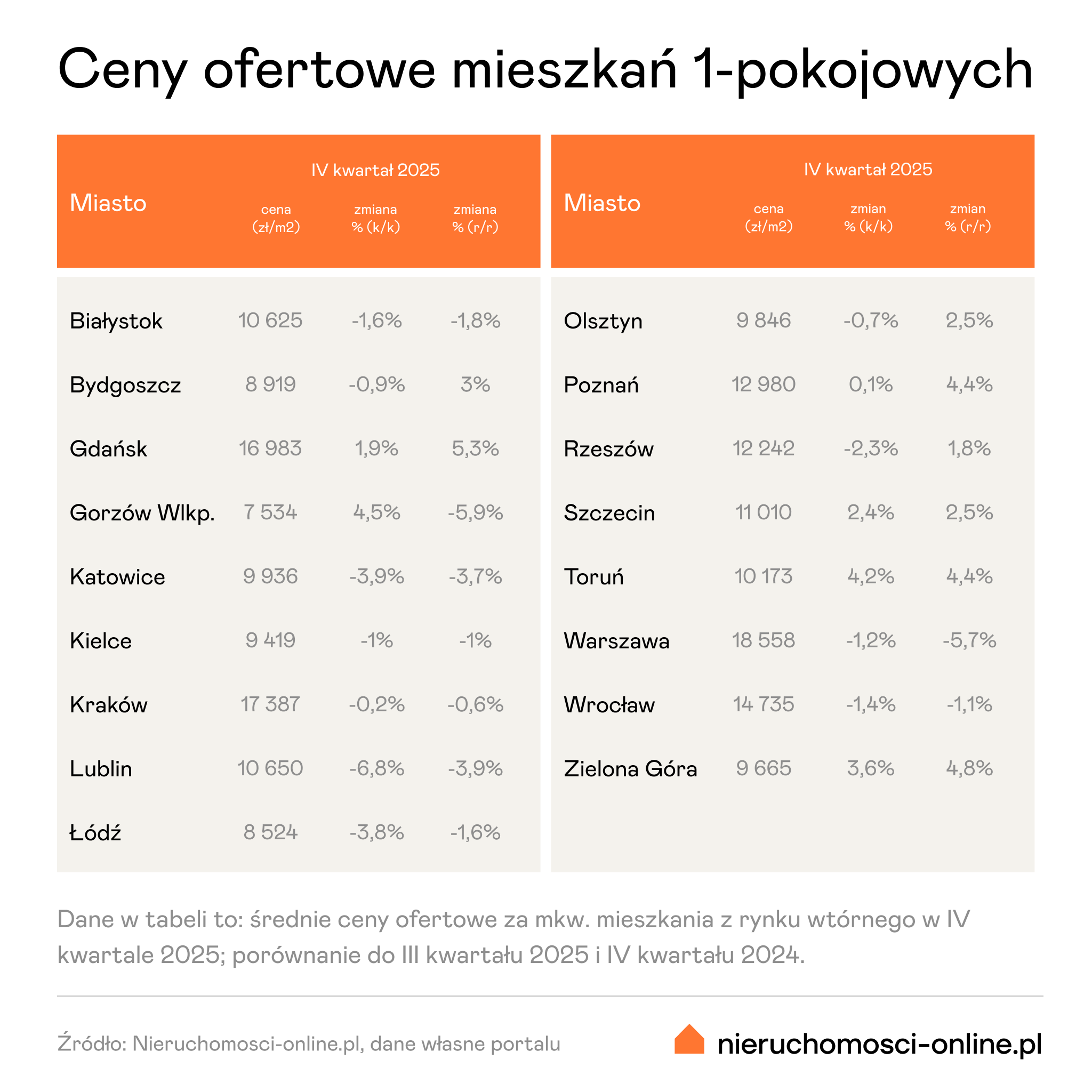 W IV kwartale 2025 roku na rynku mieszkaniowym w Polsce wyraźnie zarysował się nowy trend – spadki cen kawalerek w części dużych miast, przy jednoczesnym utrzymywaniu wysokich cen większych lokali. Z danych portalu Nieruchomosci-online.pl wynika, że przeciętne stawki za kawalerki spadły w ośmiu miastach wojewódzkich, m.in. w Warszawie, Wrocławiu i Katowicach. Tymczasem Gorzów Wielkopolski – podobnie jak Zielona Góra, Gdańsk czy Toruń – znalazł się w grupie miast, gdzie ceny małych mieszkań nadal rosły.