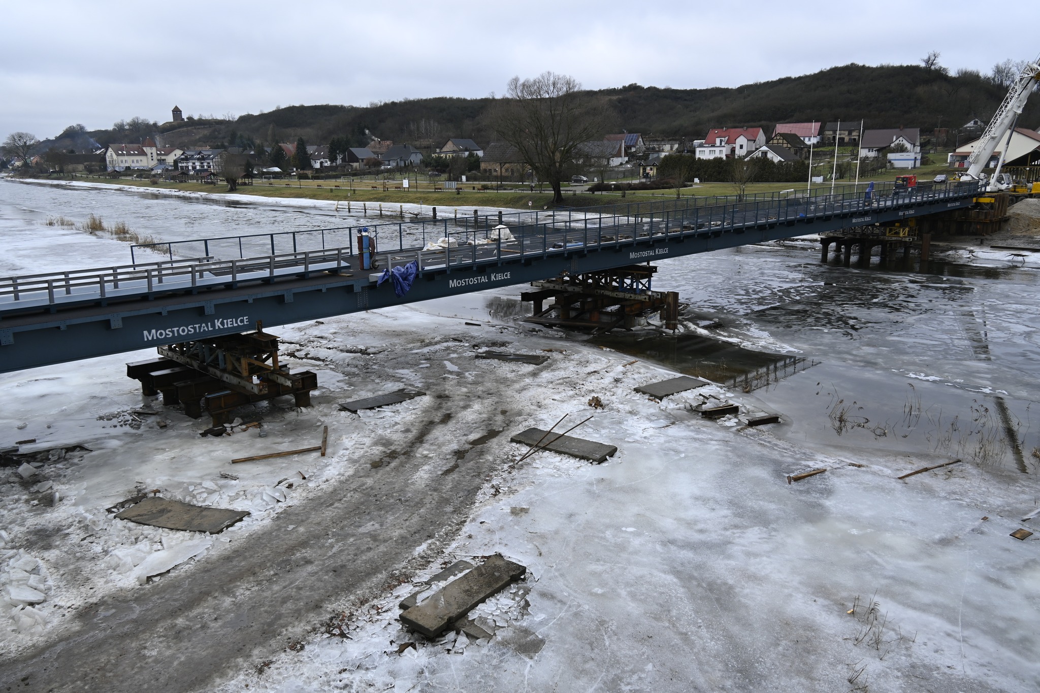 Zanim ciężki sprzęt wejdzie na starą przeprawę, wykonawca musi zapewnić alternatywę dla kierowców i pieszych. Tymczasowy most powstaje po zachodniej stronie obecnego obiektu. Zgodnie z założeniami będzie obsługiwał zarówno ruch samochodowy, jak i pieszy – z ruchem wahadłowym na jezdni oraz chodnikiem o szerokości ok. 1,5 m.