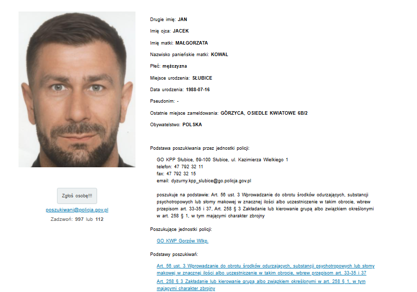 Sprawę prowadzą funkcjonariusze z Gorzowa Wielkopolskiego i Słubic. Z policyjnego komunikatu wynika, że poszukiwania mają związek z zarzutami dotyczącymi wprowadzania do obrotu środków odurzających, substancji psychotropowych lub słomy makowej w znacznej ilości albo uczestniczenia w takim obrocie. Drugi z podanych powodów dotyczy kierowania grupą przestępczą o charakterze zbrojnym.