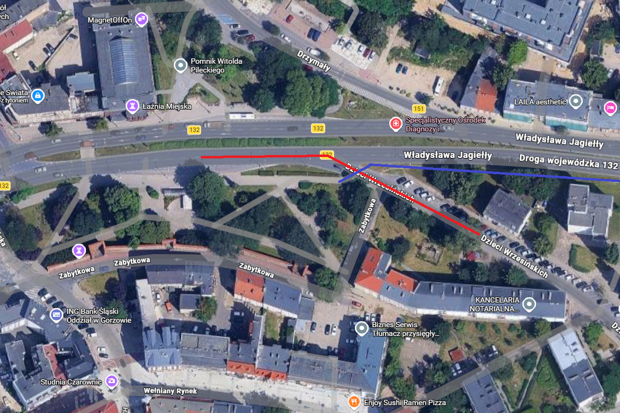 Poniżej widać fragment centrum Gorzowa z zaznaczonym przebiegiem ul. Władysława Jagiełły oraz zjazdem w ul. Dzieci Wrzesińskich. Czerwonym kolorem oznaczono tor jazdy samochodów poruszających się ul. Jagiełły i skręcających w ul. Dzieci Wrzesińskich, natomiast niebieskim zaznaczono nowo wybudowaną ścieżkę rowerową biegnącą wzdłuż ul. Jagiełły. Zestawienie obu linii pokazuje, że trasa rowerowa przecina się z torem przejazdu aut zjeżdżających z głównej ulicy, co obrazuje punkt, który stał się przedmiotem dyskusji o bezpieczeństwie rowerzystów.