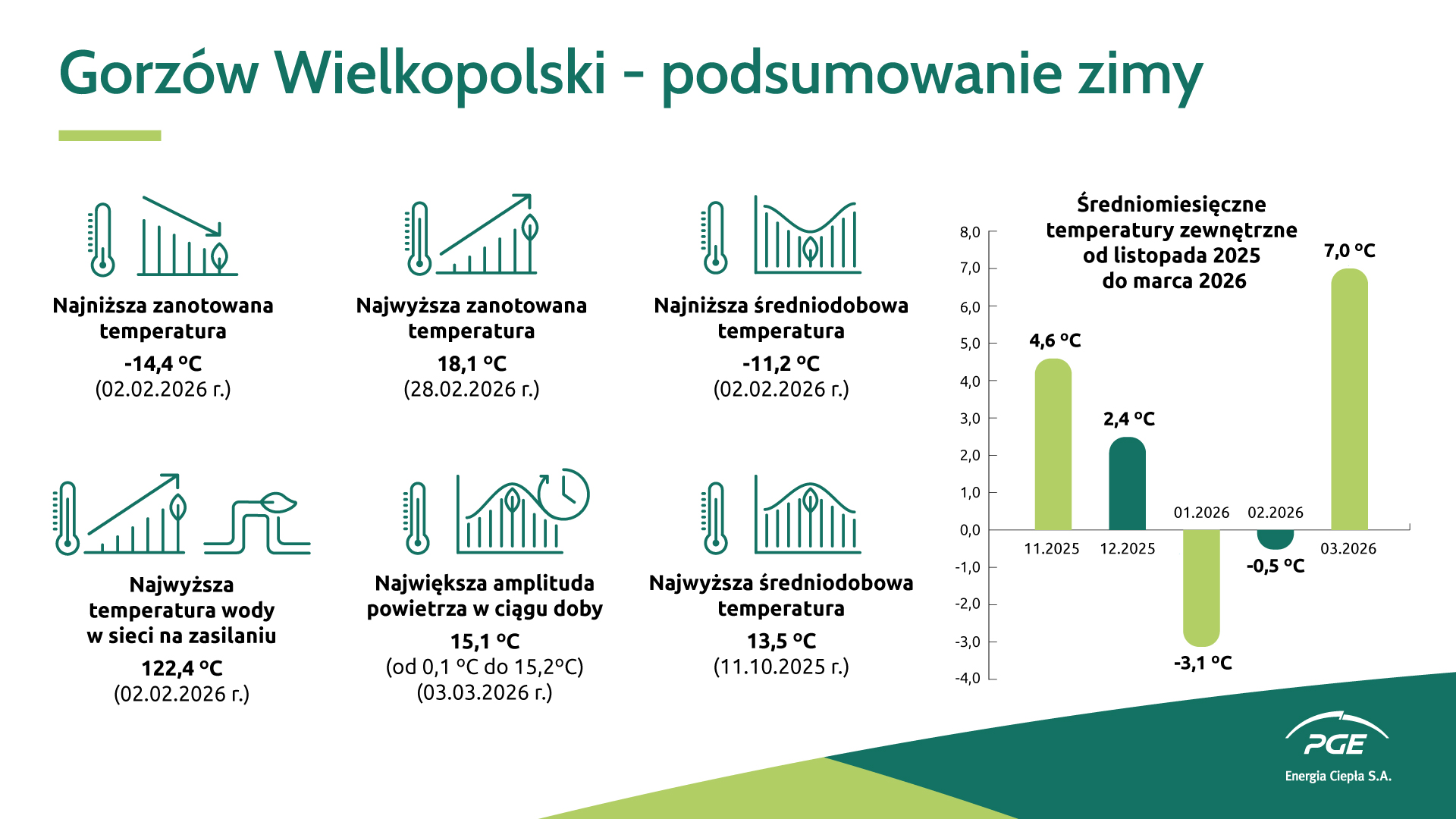 Ponad 20 dni z rzędu z ujemną średniodobową temperaturą i najzimniejszy styczeń od 2010 roku. Gorzowski oddział PGE Energia Ciepła podsumowuje sezon zimowy 2025/2026. Sezon grzewczy rozpoczął się w Gorzowie Wielkopolskim 30 września 2025 roku. Minionej zimy styczeń był najzimniejszym miesiącem od 16 lat. Średniomiesięczna temperatura wyniosła -3,1°C. Był to najzimniejszy miesiąc od stycznia 2010 roku, w którym średnia miesięczna wyniosła aż -6,4°C.